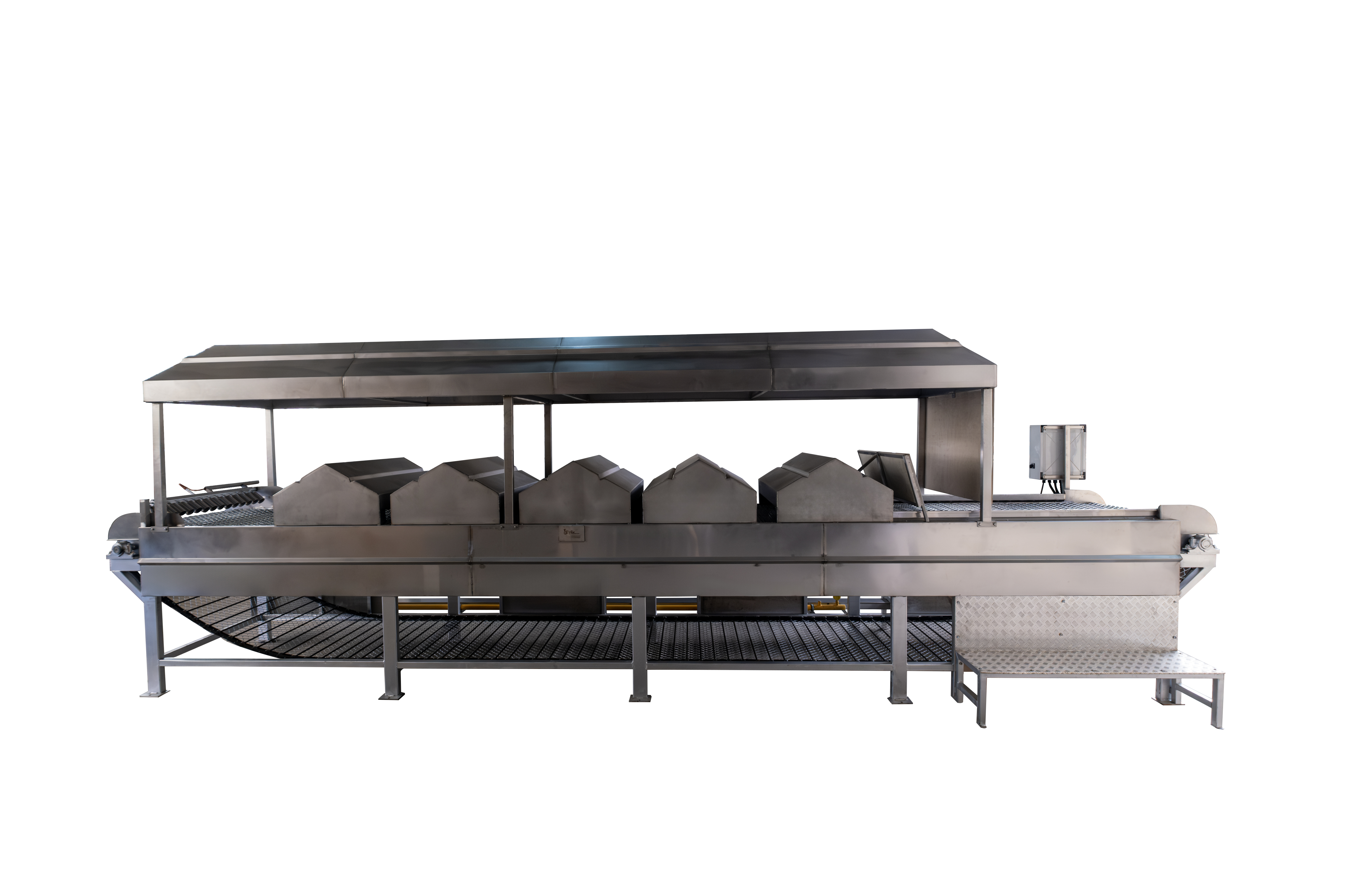 It roasts foods like peppers and eggplants by exposing them to heat on a conveyor belt.